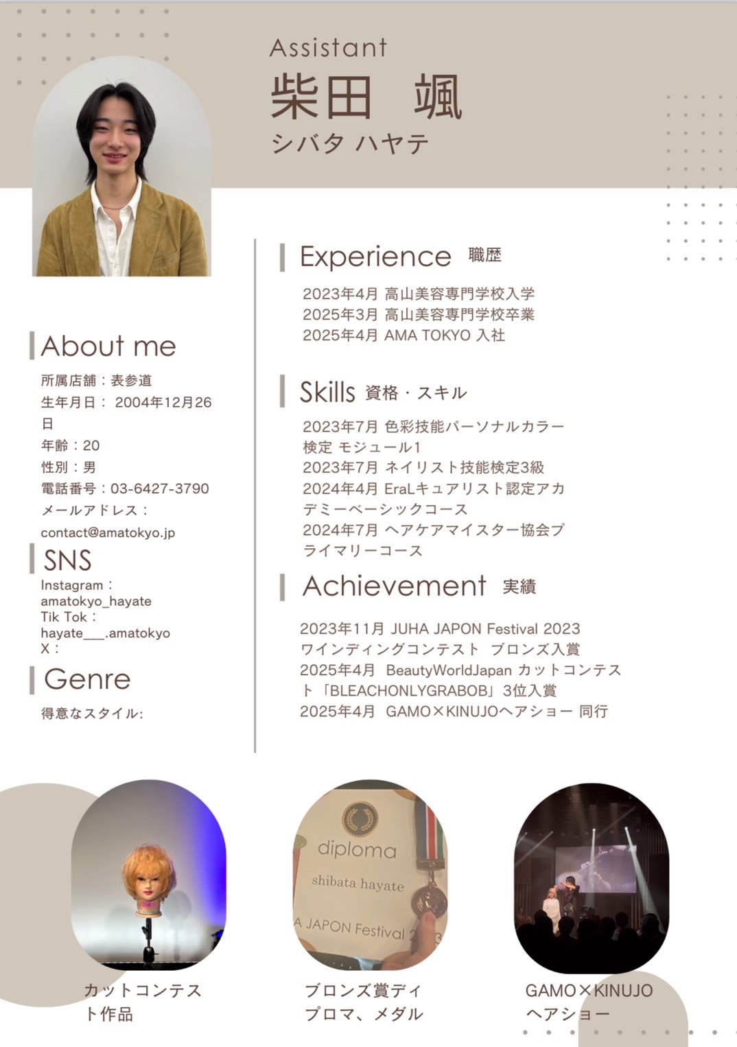 2025年、高山美容専門学校を卒業後、AMATOKYOに入社。